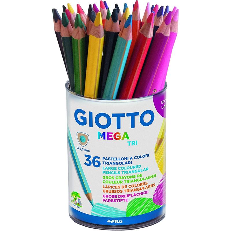 Lápices de colores triangulares de mina gigante y superresistente de 5,5mm para una gran reserva de color, barnizados en el mismo color de la mina. Disponible en 12 alegres y brillantes colores.