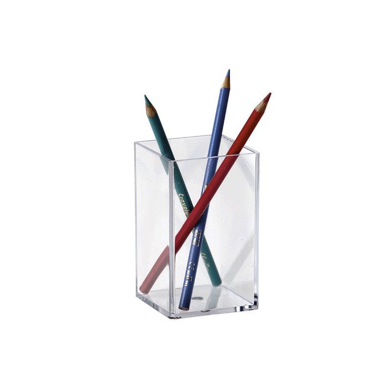 Portalápices, forma cuadrada. Gran calidad. Color transparente. Fabricado en poliestireno cristal ultragrueso.